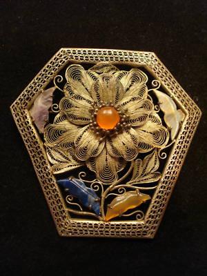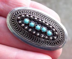 PRETTY ANTIQUE 800 SILVER TURQUOISE FILIGREE BROOCH     Completed    $16.69