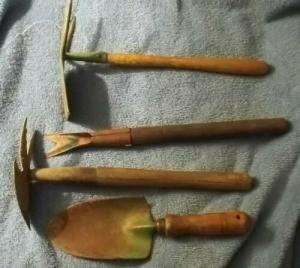 4 vintage Garden tools 2 hoes, spade, wood handle     Completed    $6.99