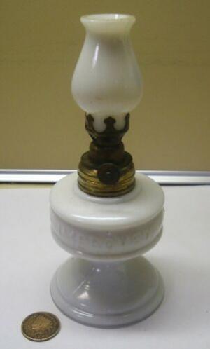 Banner Milk Glass Miniature Oil Lamp Complete     Completed    $10.5