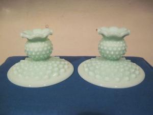 Milk Glass Lite Green Hobnail Candlesticks two     Completed    $9.99