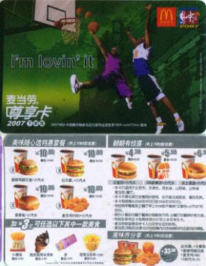 CHINA 2007 BASKETBALL NBA McDONALD GIFT CARD     Completed    $2.99